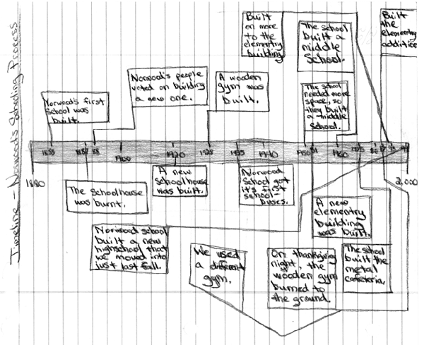 In 1883 Norwood's first school was built. It was a little house with one room. Not very many people went to the school. It burned down in 1887. In 1920 a three-story building was built for a school. There was a gym in 1928 that stood where our current gym stands now. It was the best gym around. Unfortunately it burned down in 1985 about 7:30 p.m.